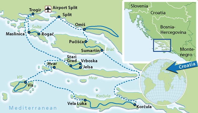 Today we discover the island of Korčula by bicycle and enjoy our lunch break in one of the local restaurants. The calmness and remoteness of the vast vegetation and cypress gardens have given the shape to the probably most beautiful Dalmatian island. Our cycle tour leads us via the village of Blato, like Rome build on seven hills, along a pass road across Pupnat bay and finally to Korčula town, where we have time to take a walk through the wonderful old town with its narrow “fishbone like” alleys. We stay overnight in Korčula town. (Good to know: Pictured graphic leads in opposite direction.)