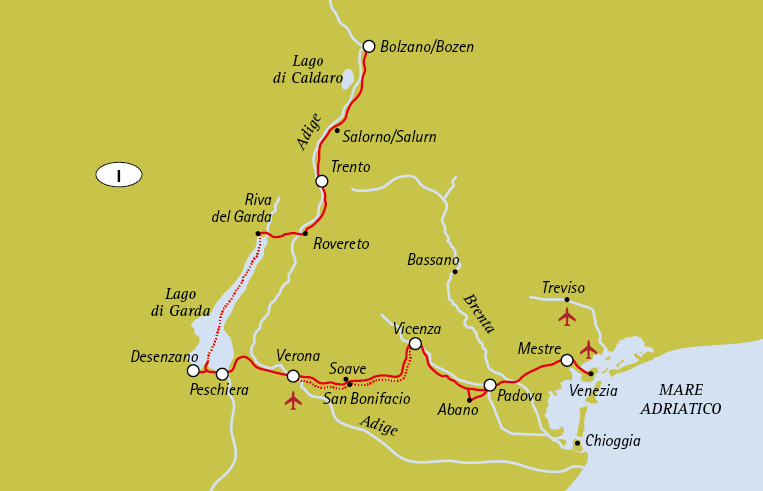 The cycling route starts from the Dolomites, part of the UNESCO world heritage list since 2009 then following the mountains around Bolzano, the beauty of lake Garda, the remarkable cities like Verona-the town of Romeo & Juliet, Vicenza- renowned for the classical Palladio architecture, Padua- home to the one oldest European Universities, and the fascinating Venice.