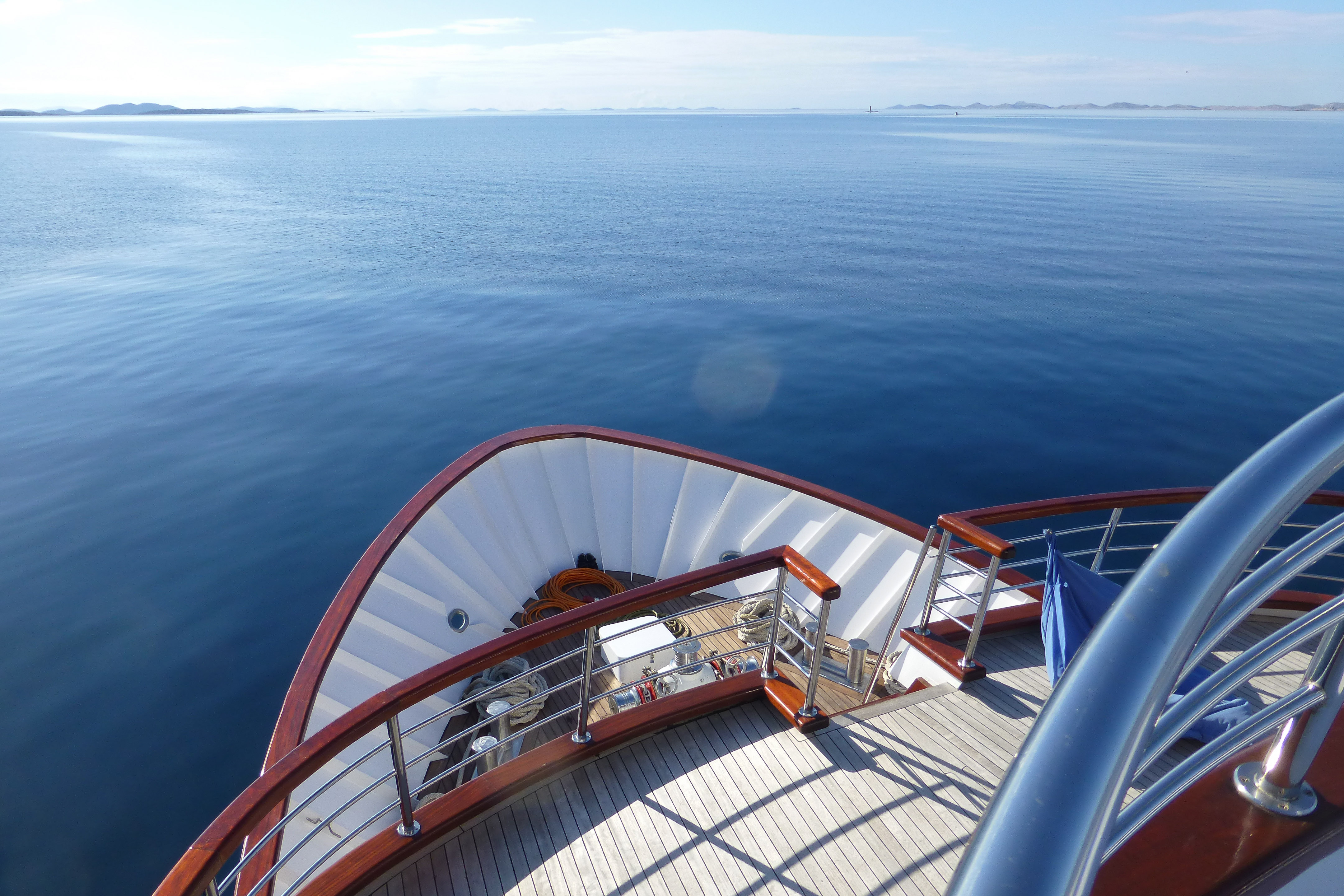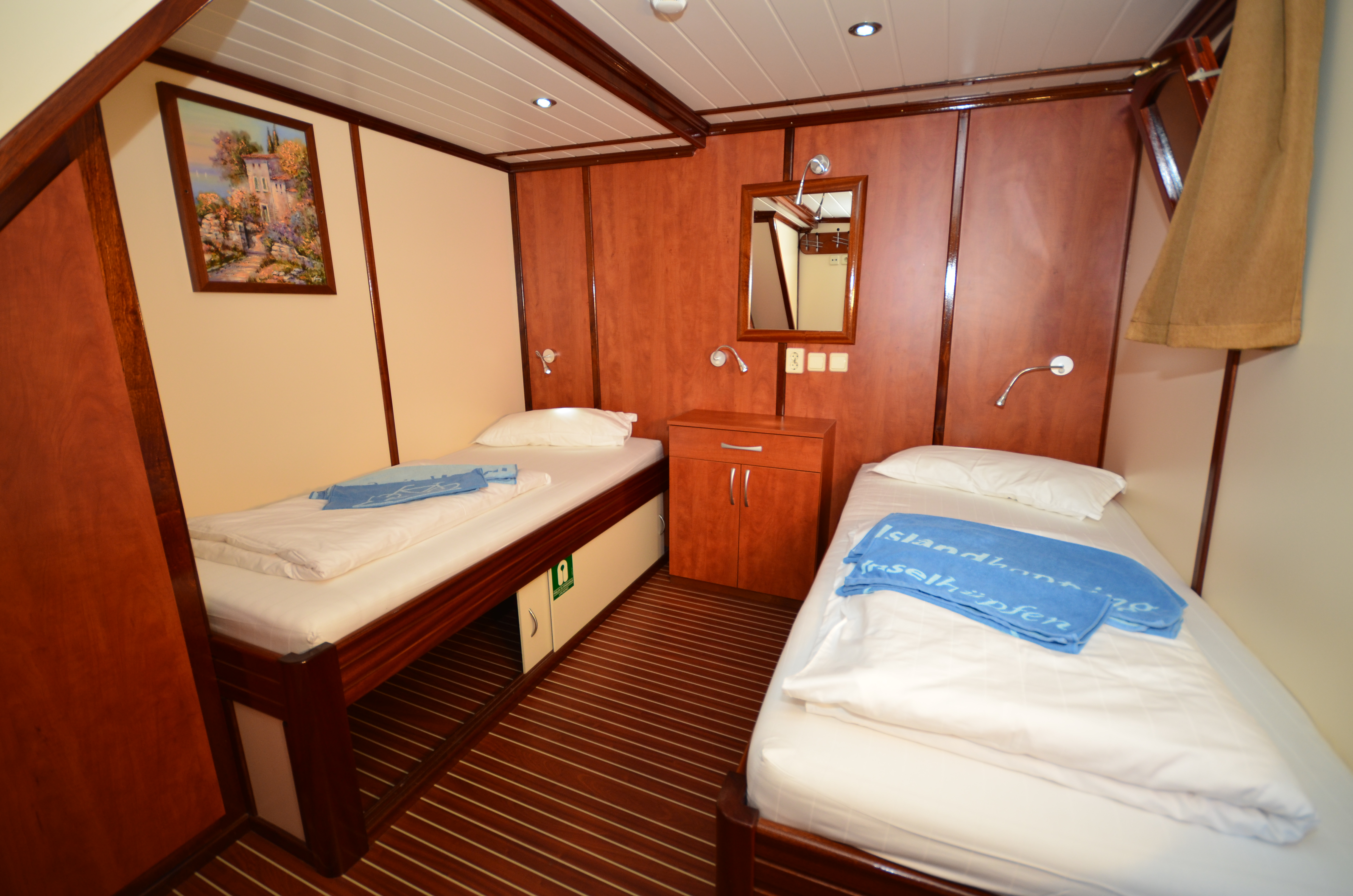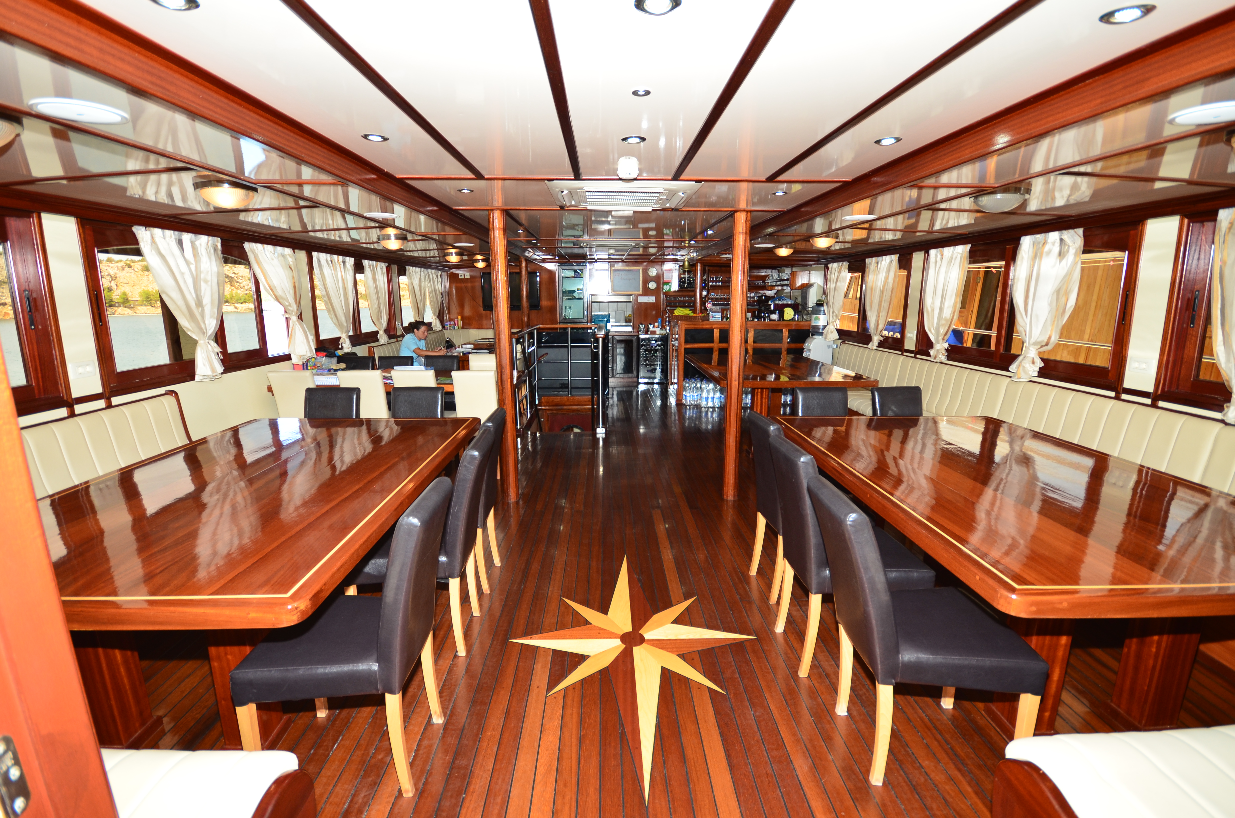 17 comfortable and spacious guest cabins with a size of 40-46 sq ft. (12-14 qm) including a tiled bathroom with shower cabin are at the guests’s disposal. The ship has a swimming platforn at the stern, which enables an easy access to the sea.